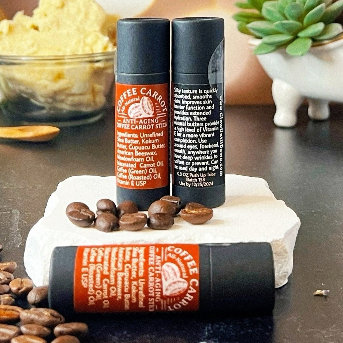 I use the coffee carrot stick under my eyes every day because my skin is so dry. I love it because it stays on and doesn’t dry out. It was delivered in record time. It came with a little free gift that was so appreciated. I will def be ordering again. Thank you!!