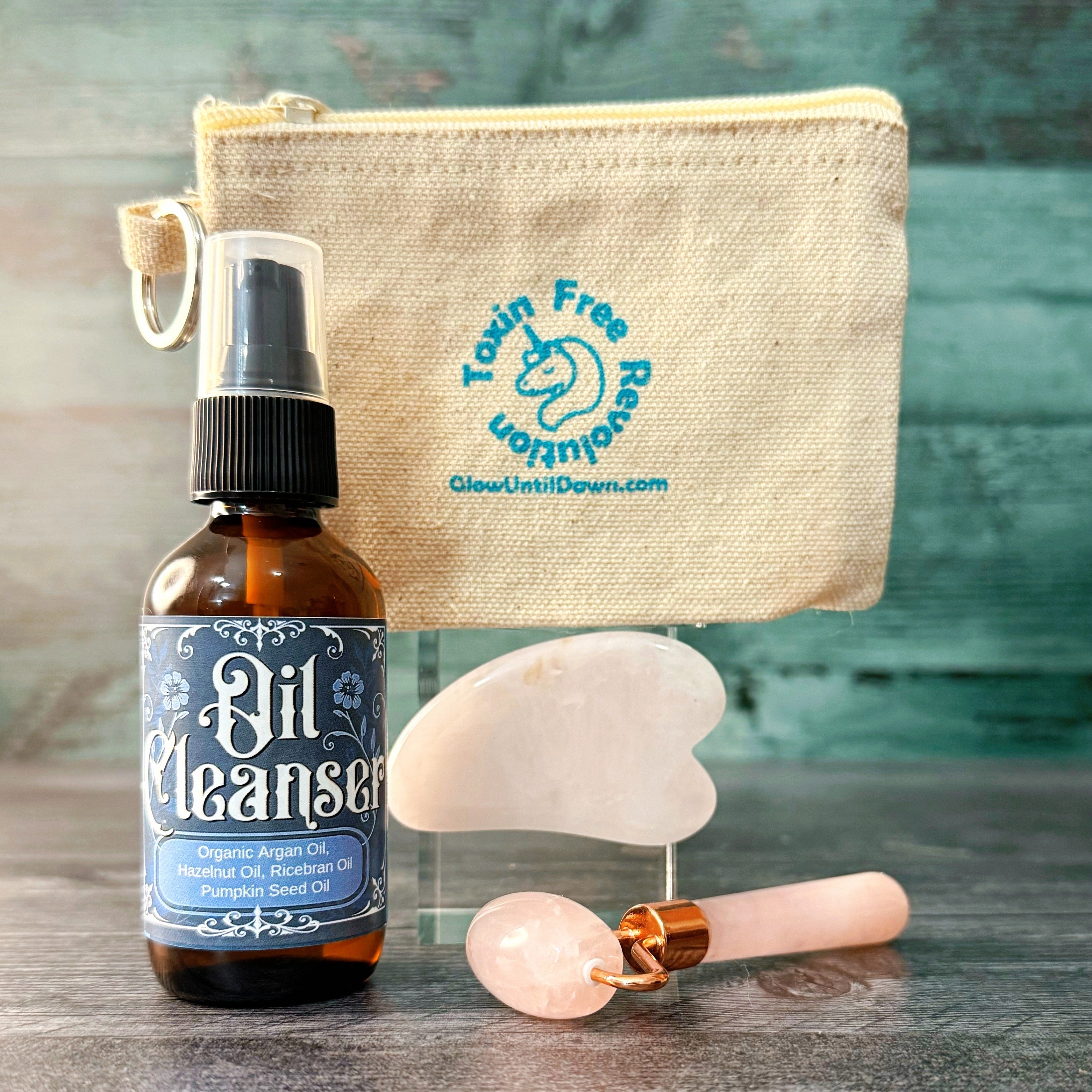 Turn your cleansing step into a moment of self-care. Our full-size Argan Oil Cleanser melts away impurities while you take a few mindful minutes for facial massage. Use the rose quartz gua sha stone and mini roller to ease tension, boost circulation, and leave skin refreshed. Everything tucks neatly into a glow-branded accessory bag. Your little luxury kit ritual of balance, clarity, and calm.