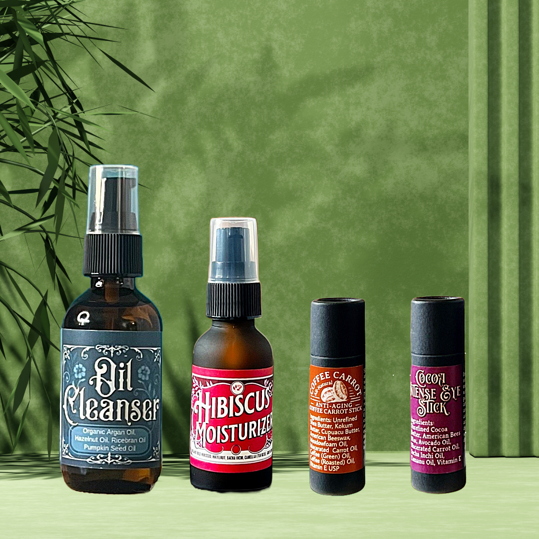 Set includes a full size 3-in-1 Oil Cleanser, a full size Hibiscus Moisturizer, a full size Coffee Carrot Serum Stick, and a full size Cocoa Intense Eye Serum Stick.